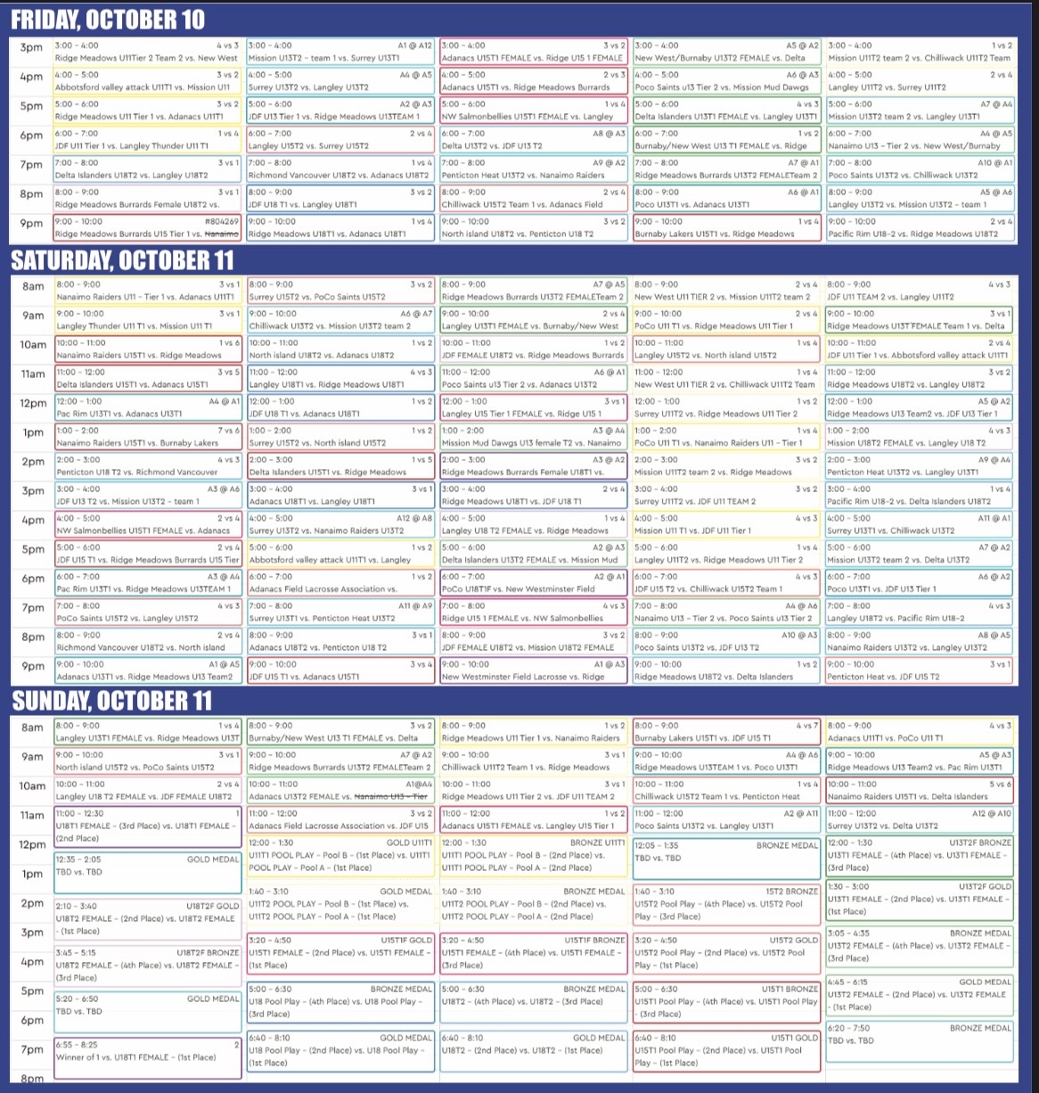 The Thunderstrike Field Lacrosse Tournament will be held from October 10-12, 2025, with games starting as early as 8am on Friday, October 10. Medal games will conclude on Sunday, October 12.
